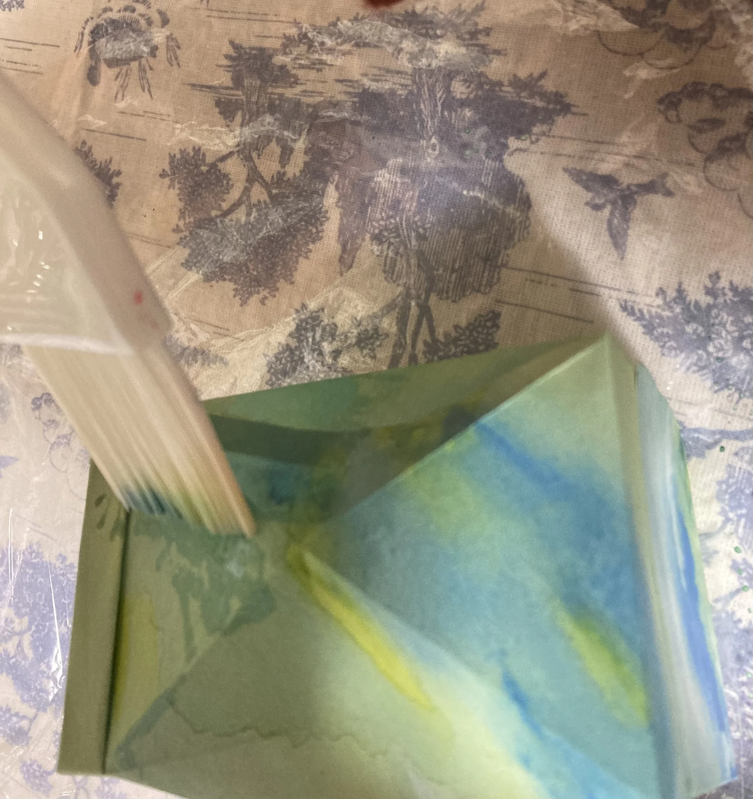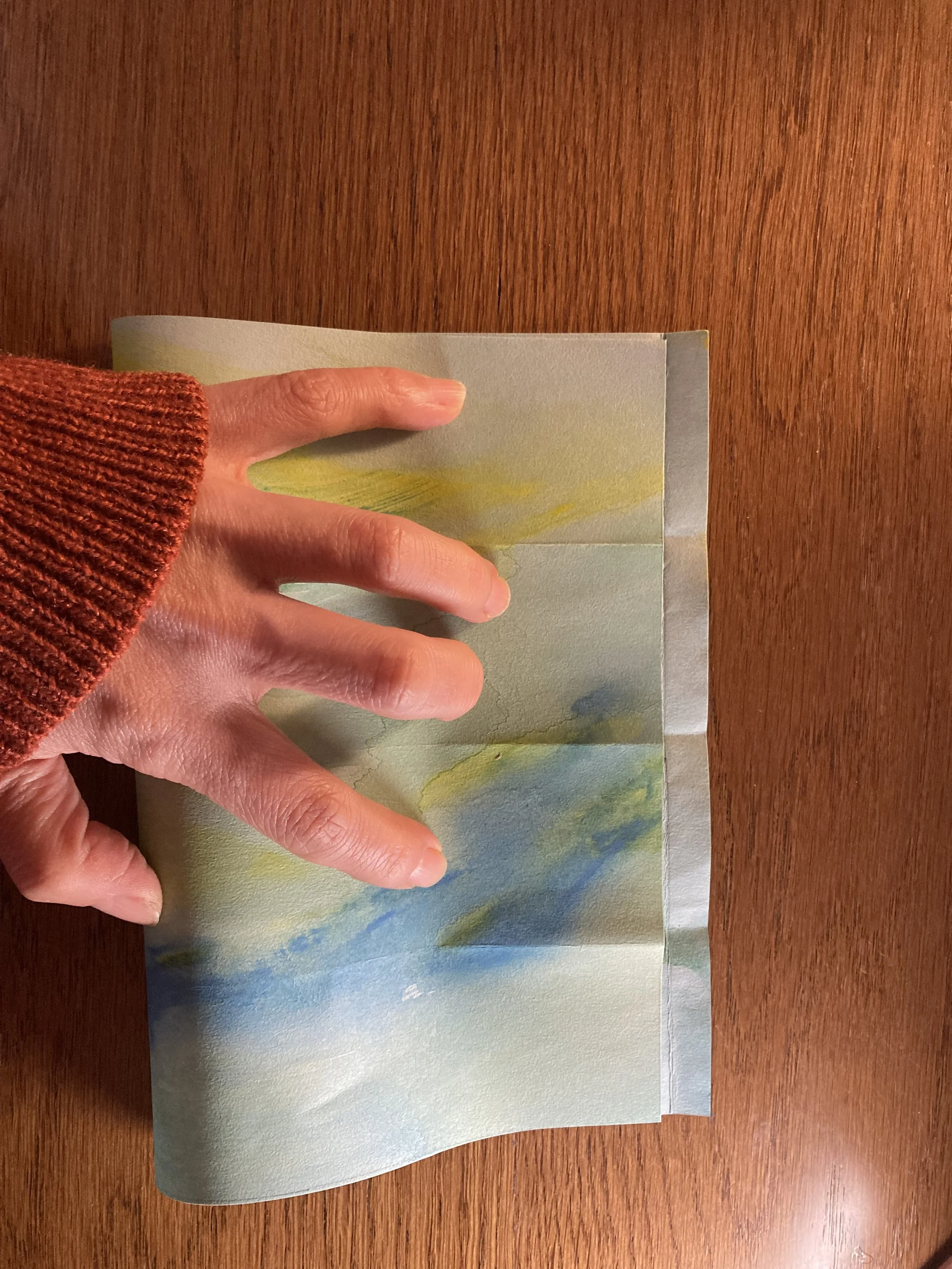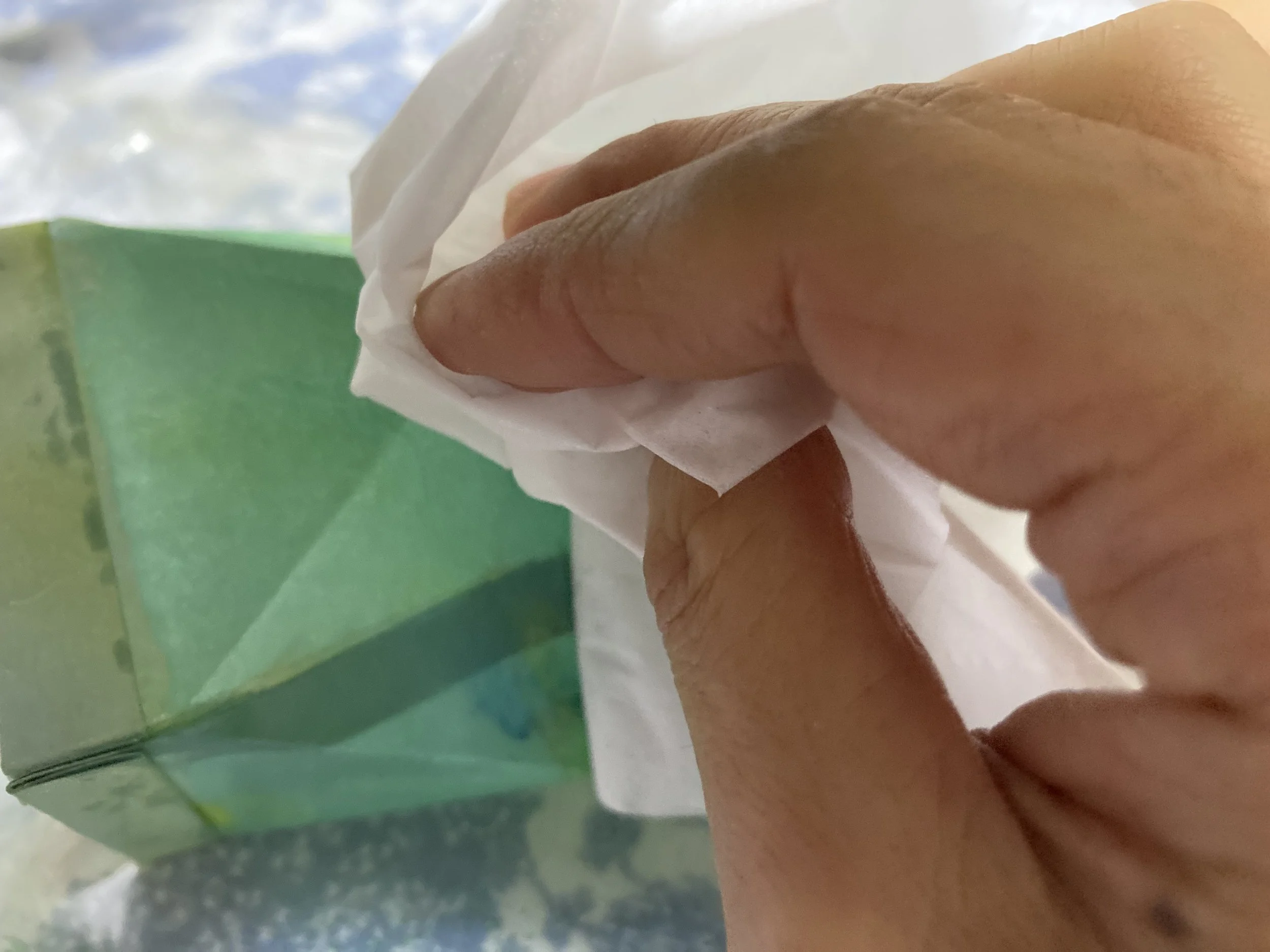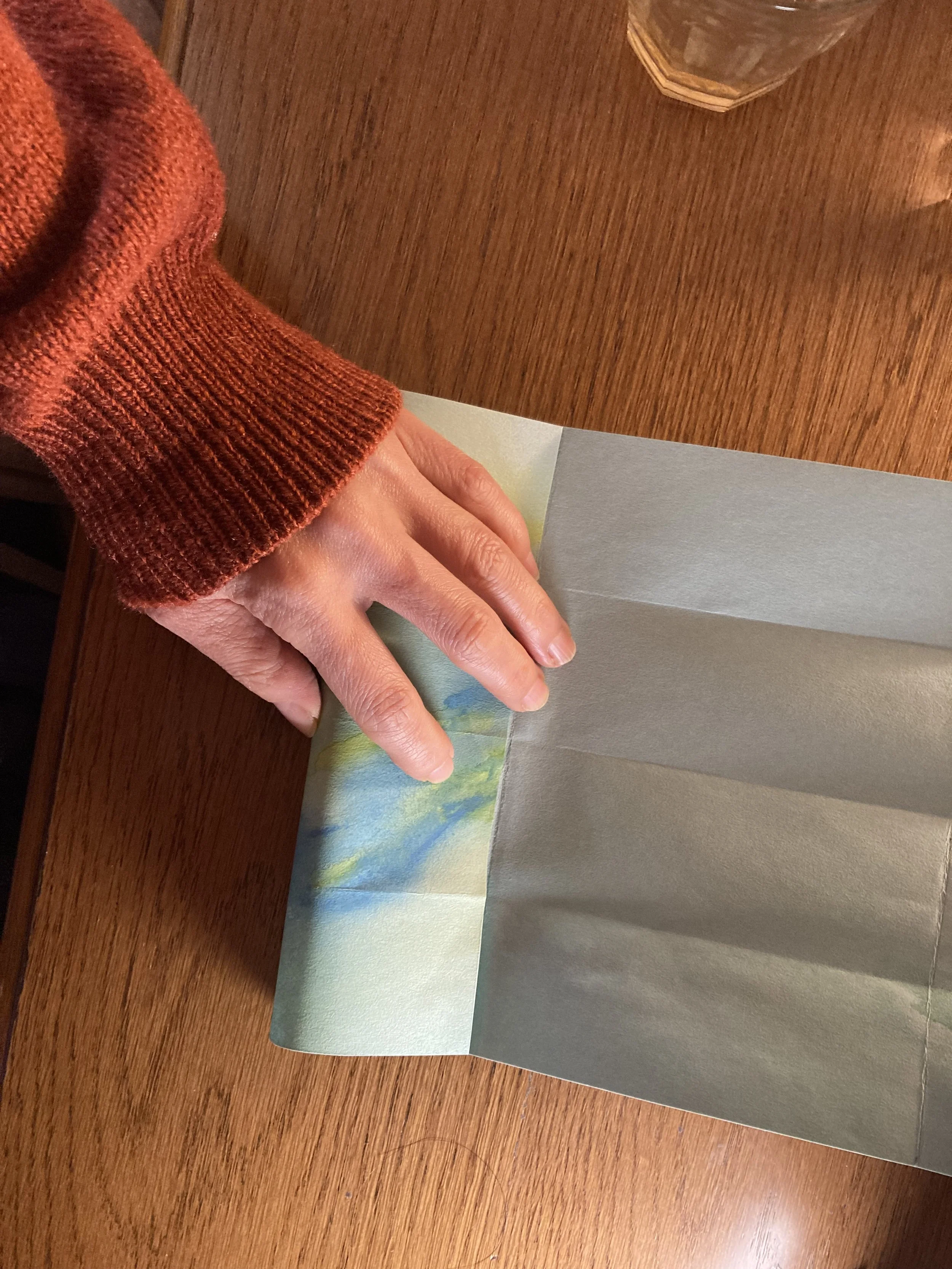 本番で使用する紙を余分に用意しておいて、試し用のものに色を少しつけてみましょう。それが乾いたら、オイルを塗って、色の滲み具合やペーパーがオイルを吸収するかどうか、ベタつきなく綺麗に乾くかどうかをチェックしておくと失敗が少なく安心ですね。私はスペイン製のバージンオリーブオイル(食用)を使いました。日本製の食用オイルは加工の仕方が違うため、ポルトガル、ギリシャ、イタリア、スペインなどの外国製のオイルの方が紙にベタつきが残らないかもしれません。けれど特に高級な物を購入する必要はありません。