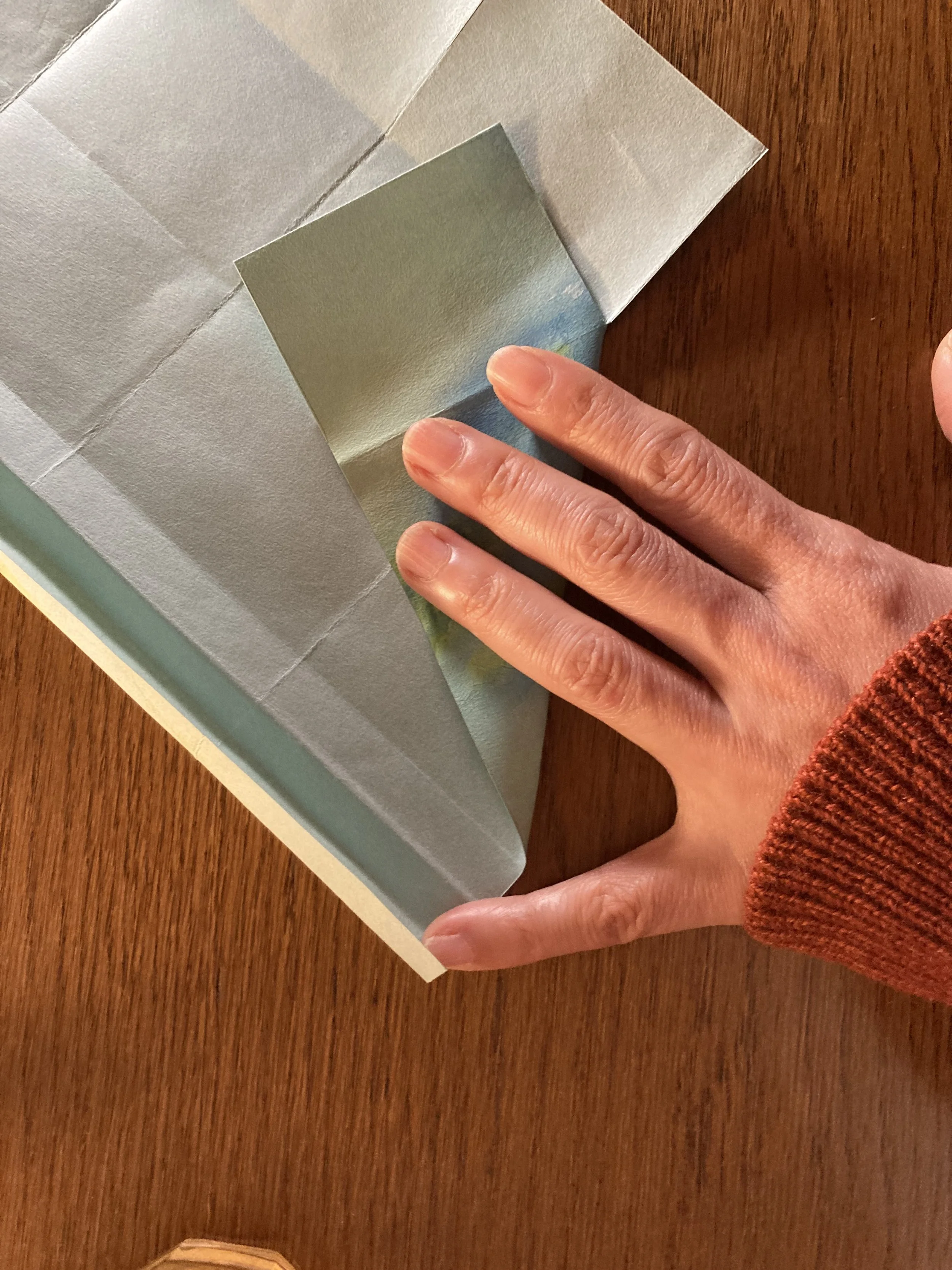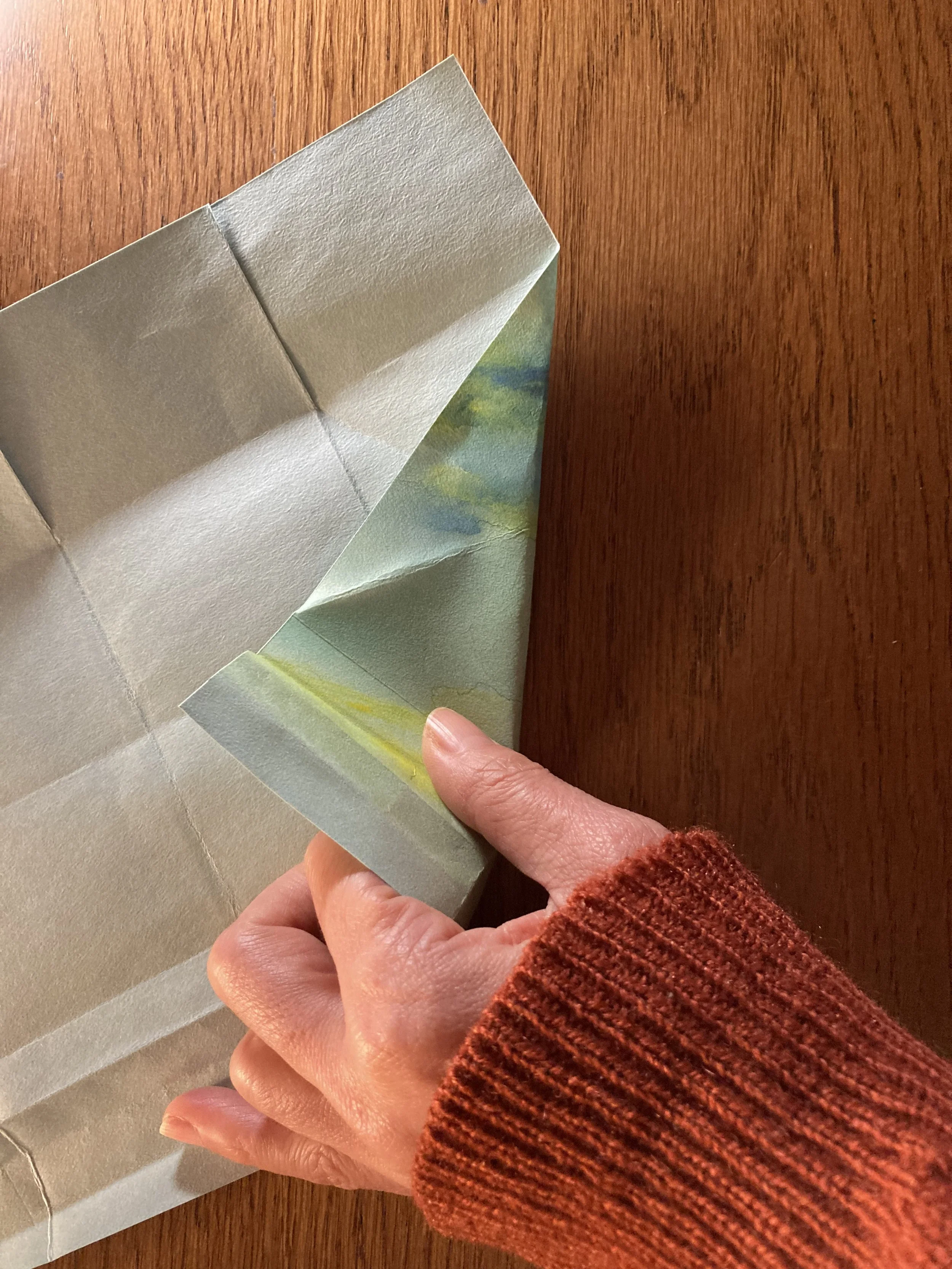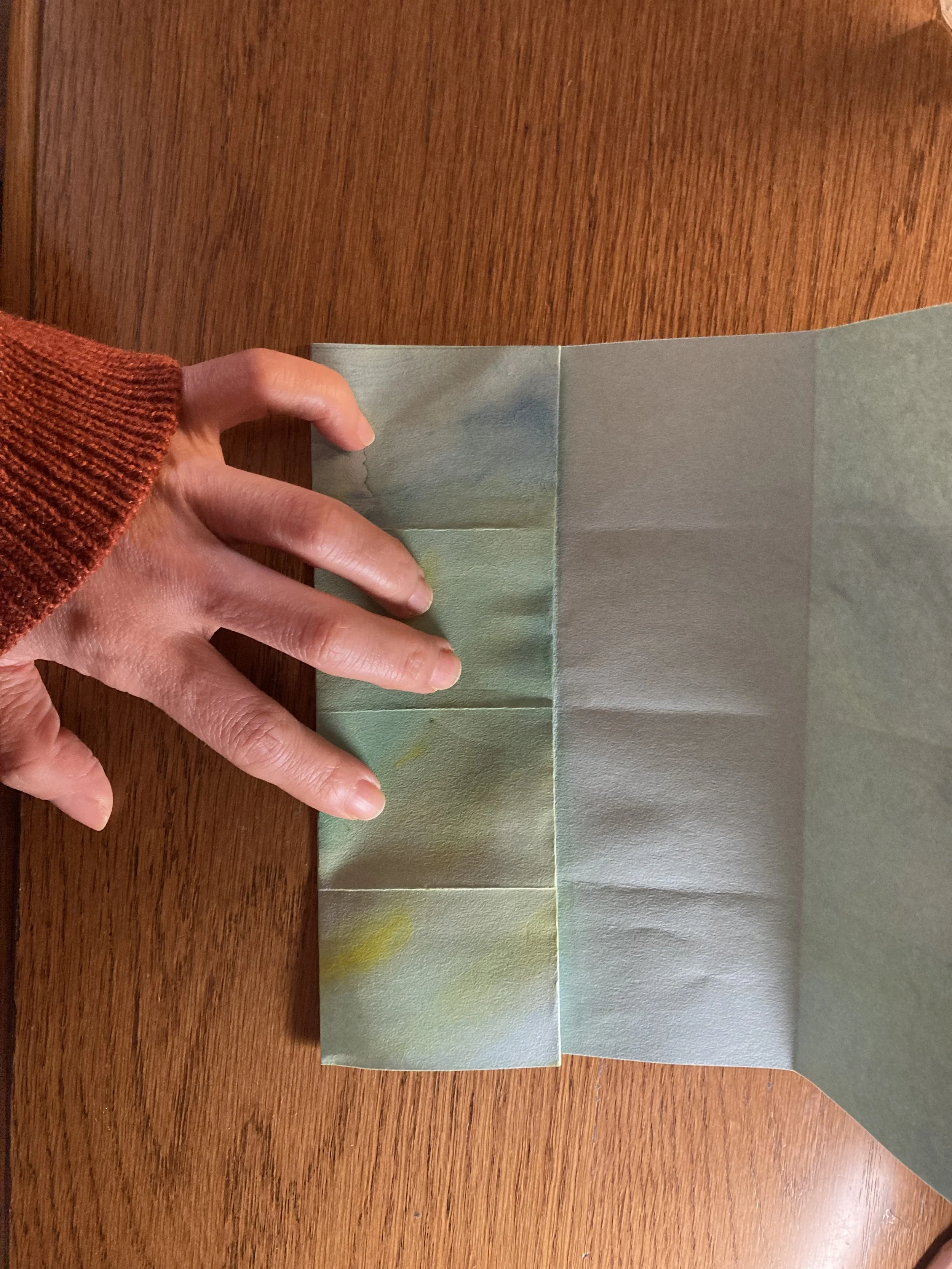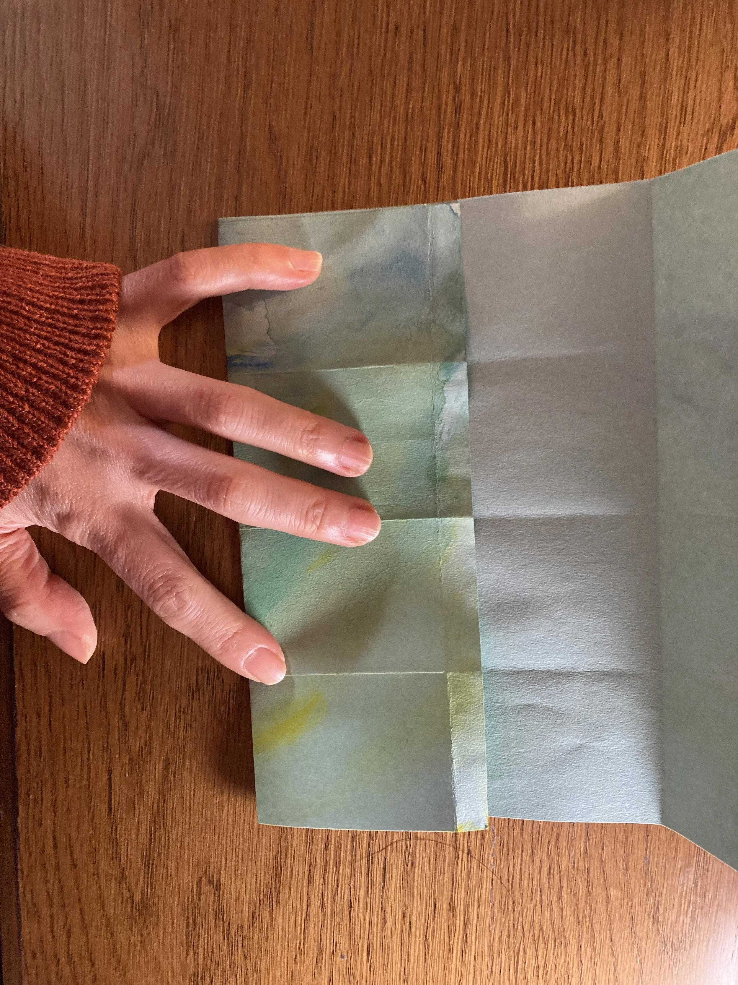 そのままで上下ぴったり半分になるように折り、開いてから、そのまた半分になるようにも織り込んで折り目をつけます。外側が山折りになるようにします。