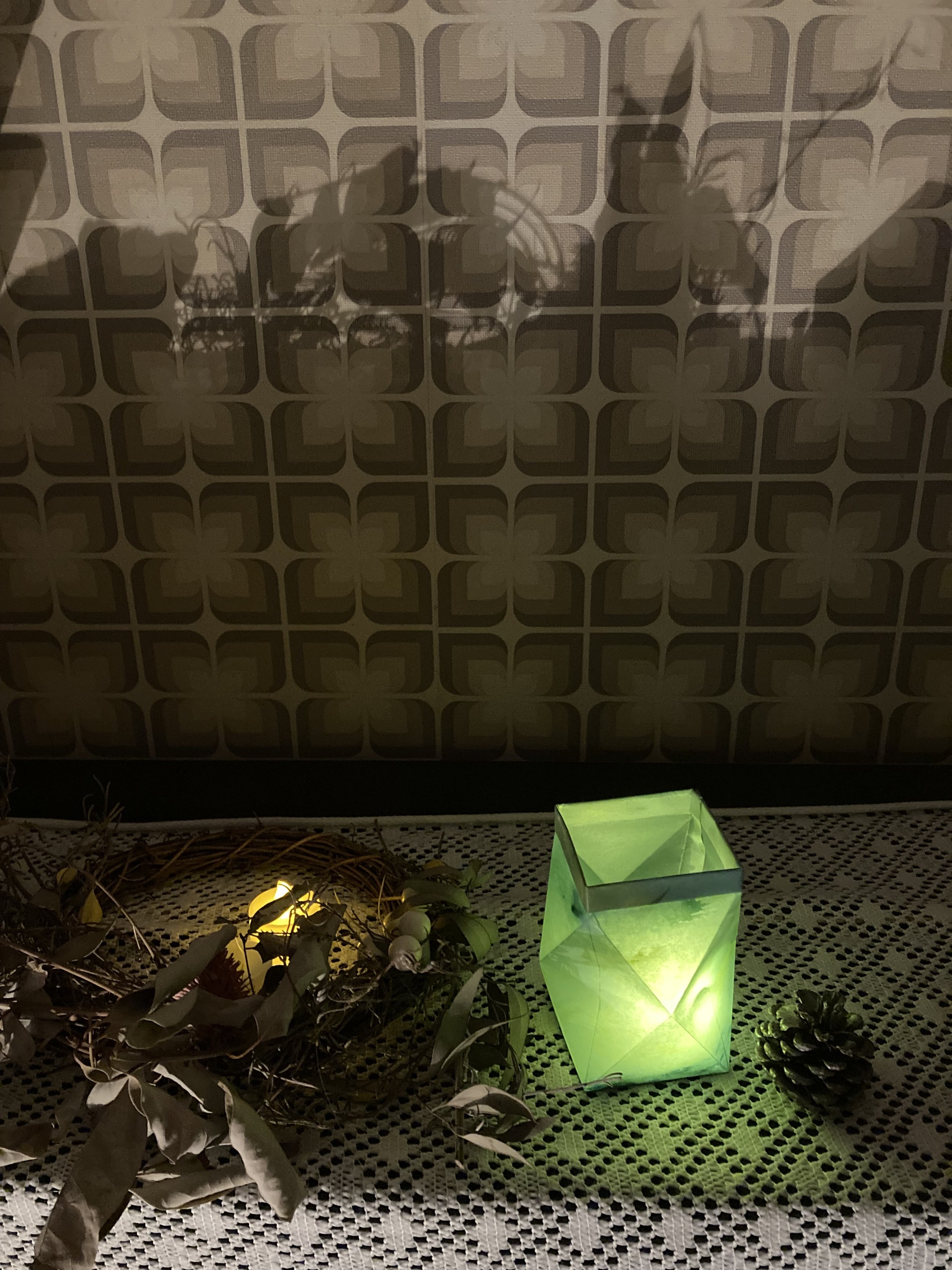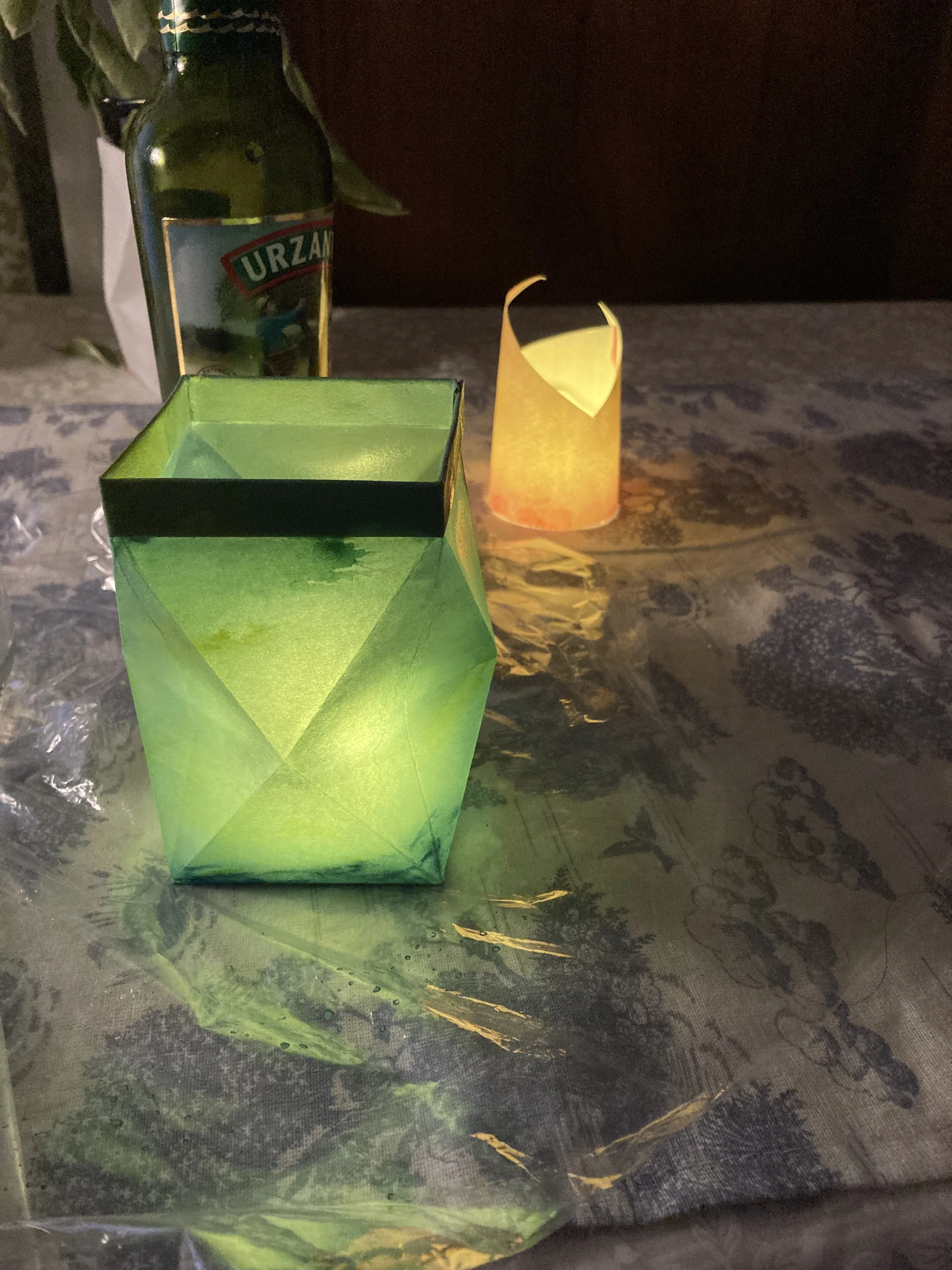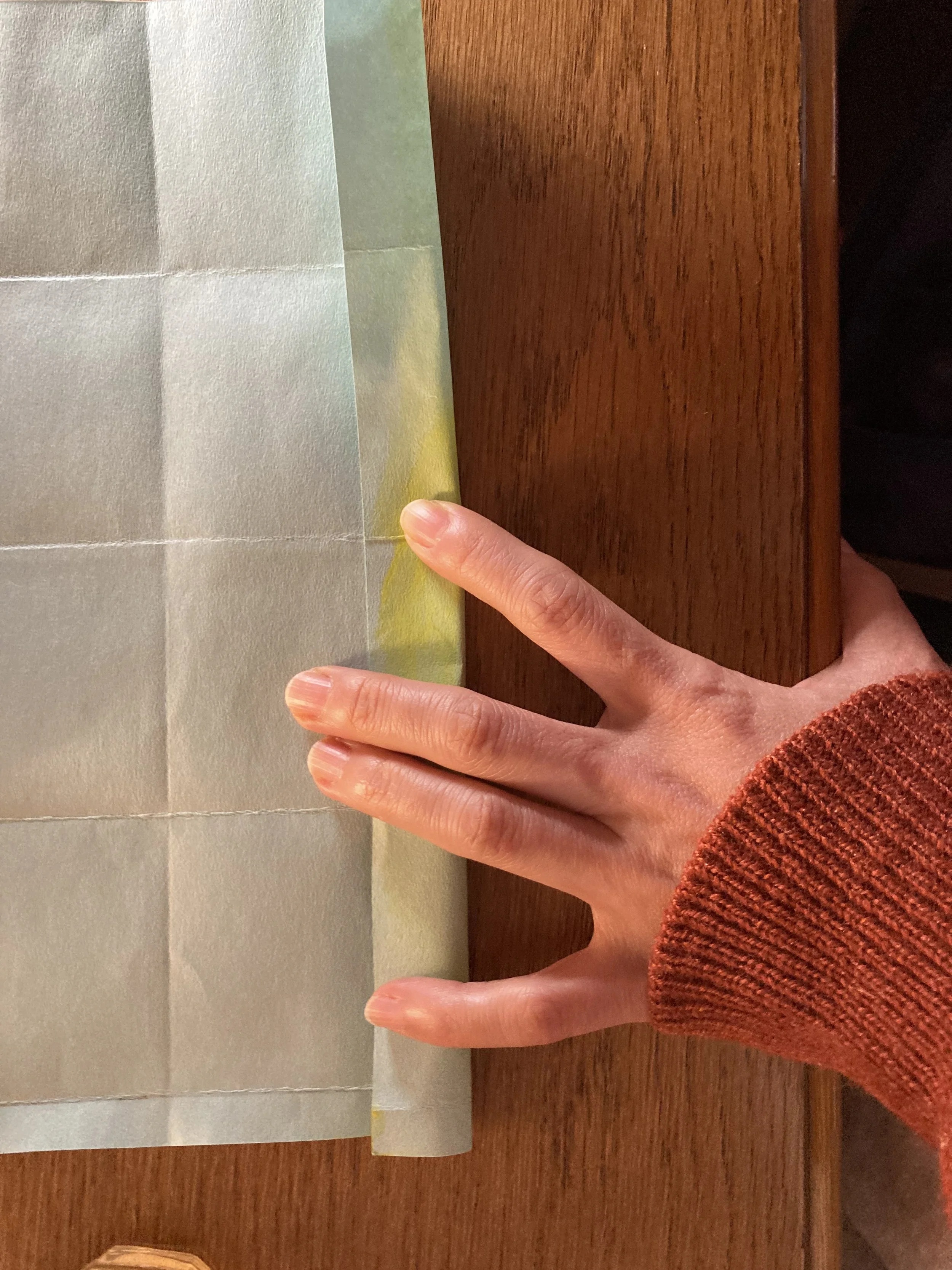 出来上がったカバーの外面jにオイルを塗り、乾かすことで、光が美しく透けて通るようになります。一晩くらいでベトつきはなくなり使用できますが、オイルがしっかりと紙に馴染んで安定するまで、1週間くらい少しずつ微妙な変化があります。