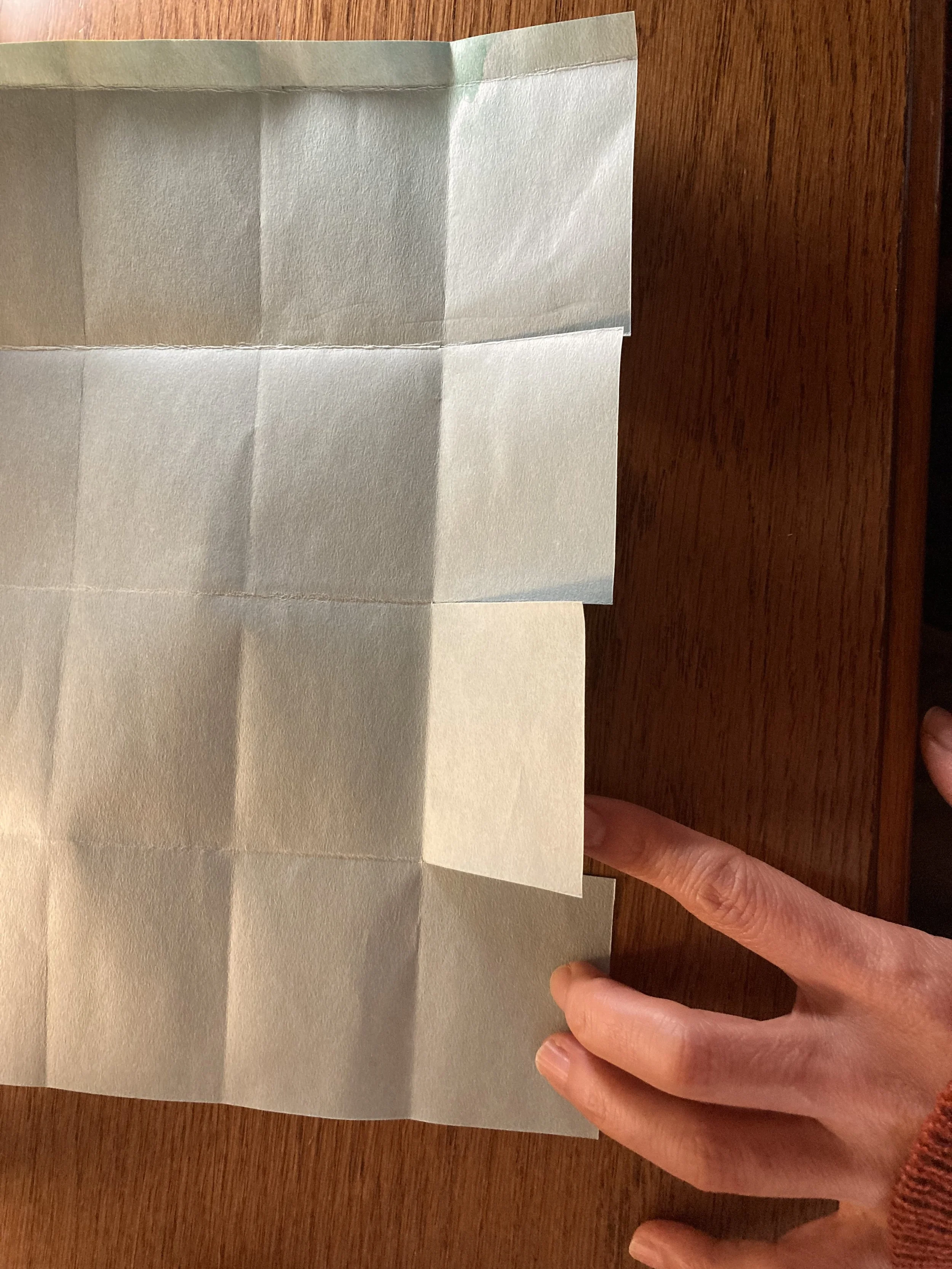 一旦開いて、今度は1の折り目の残りの部分でぴったり半分になるように、その後、もう一回その半分の幅で折り目ができるようにおります。すべての折り目は、綺麗にぴっしりとつける方が良いでしょう。