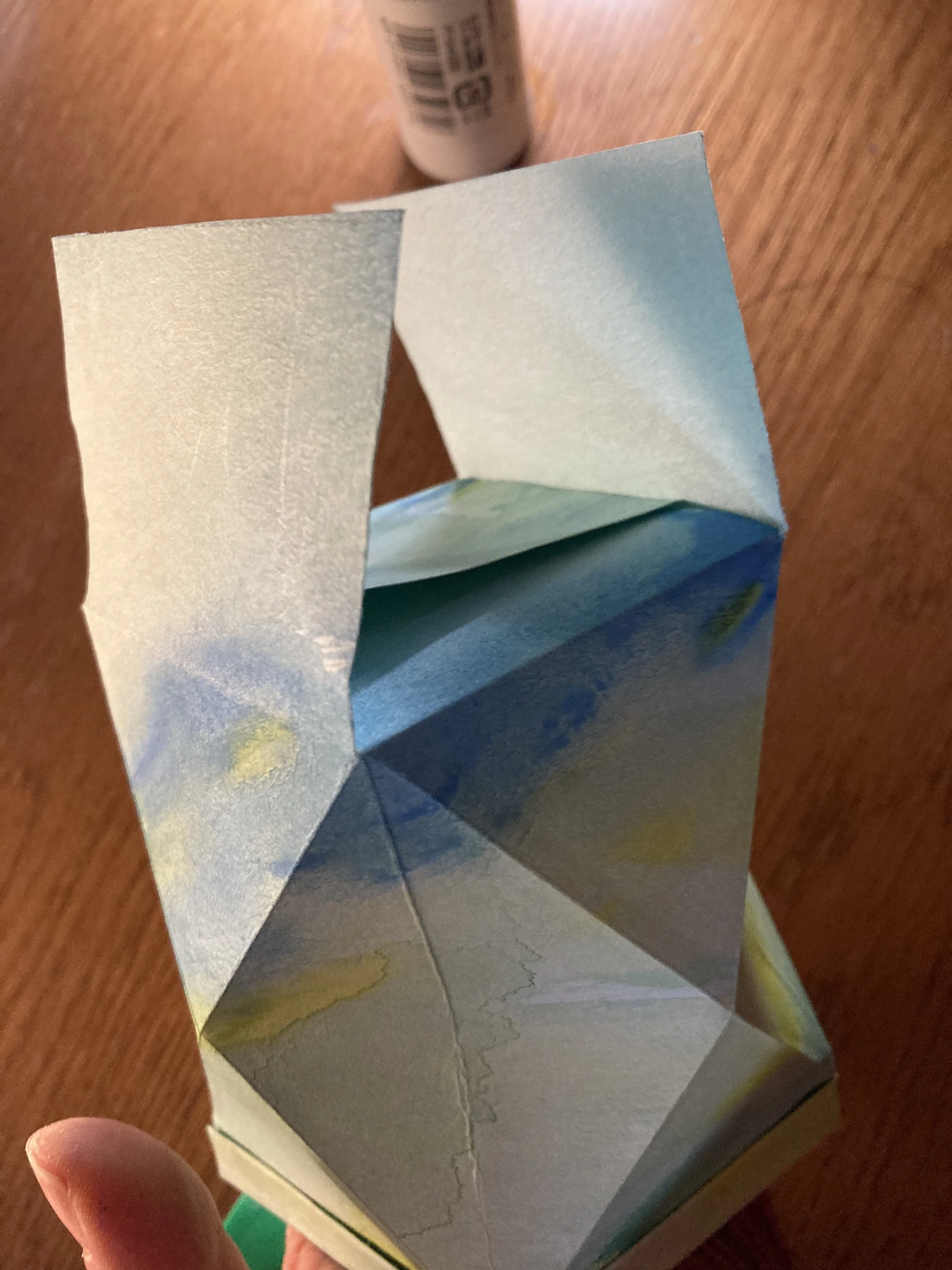 すべての折り目が山折りになっていることを確認して、色のついた面を外側にして筒状にし、のりで固定します。